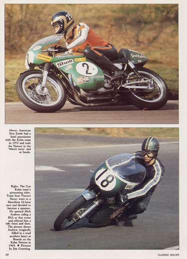 Mick Andrew rode a BSA at that event and Vincent asked him on the spot if he'd join the Gus Kuhn team. Mick turned out to be a brilliant choice and on his Norton debut at Lydden, the first time a Commando had been raced he finished second just behind Dave Croxford on a Seeley. "Old 'Crocket' was a bit surprised," says Vincent.