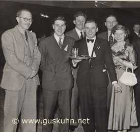 This picture shows Dennis celebrating the TT win at the 1949 BMCRC Dinner Dance. L to R: Roland Pike, Geoff Duke, Vincent Davey Snr, Lashmar with tray, unknown and Marian Kuhn. |